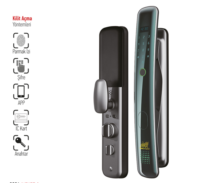 - Parmak izi, şifre, IC kart, APP ve anahtar olmak üzere 4 fonksiyonlu mekanik silindir ile açılabilen motorlu dış kapı kilidi