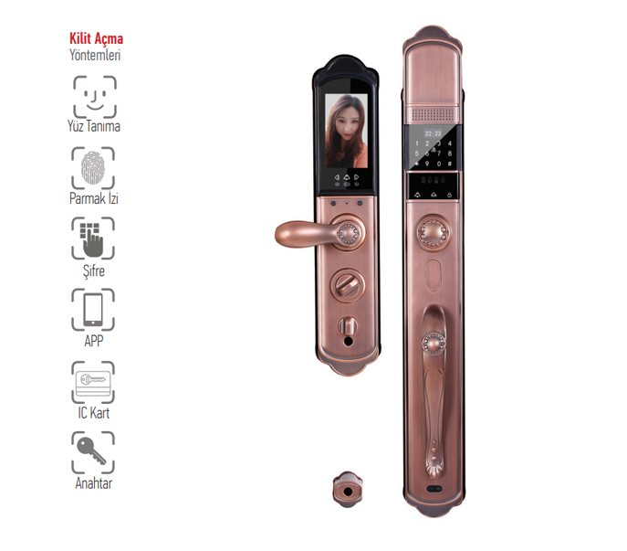 - 3 D Yüz tanıma, parmak izi, şifre, IC kart, APP ve anahtar olmak üzere 6 fonksiyonlu mekanik silindir ile açılabilen motorlu dış kapı kilidi